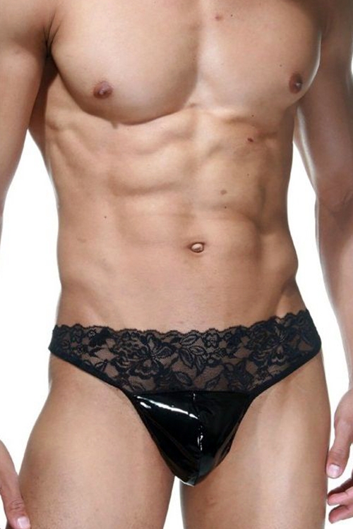 Эротические трусы-танга чёрного цвета сочетают в себе кружевной пояс, кружевную заднюю часть с лаковой гладкой вставкой в районе мошонки. Такие трусы смотрятся эффектно и сексуально.
